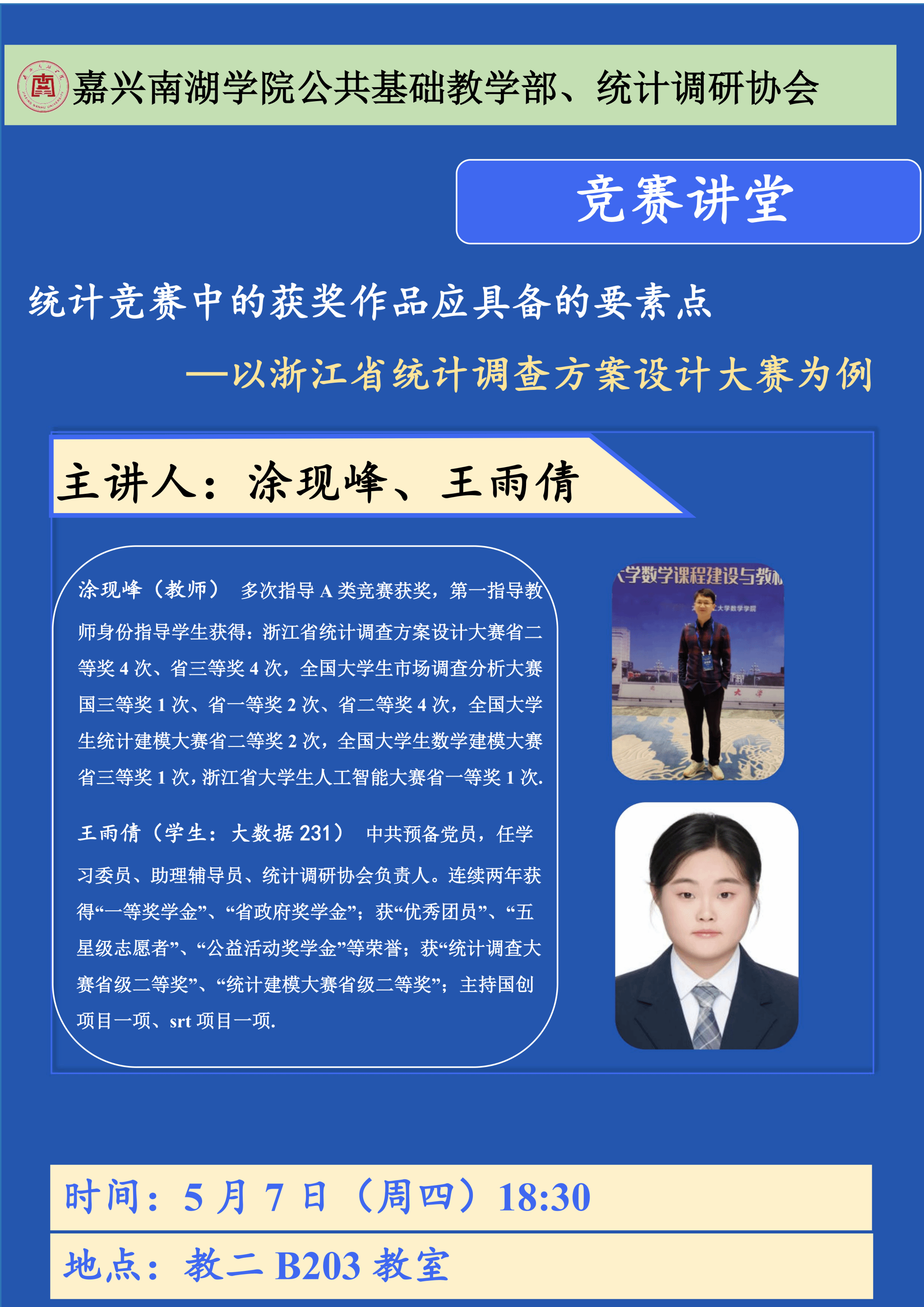 浙江省大学生统计调查方案设计大赛(A2类竞赛),由浙江省教育厅与浙江省统计局联合举办,现已发展成为颇具影响力的区域性专业赛事,大赛以“深入实际,调研社会”为主题采用自选命题的方式,内容包括调查方案设计、调查问卷设计、实地调查、数据处理、调查报告撰写等方面。统调大赛有利于培养大学生从实际问题出发的洞察理解力、小组讨论的合作沟通力、问题解决方案的报告书写力,从而促进应用型人才的培养。为高质量推进2026年的统调大赛,公共基础教学部统调指导团队联合学校统计调研协会开展讲座活动,详细信息见海报。热烈欢迎各位师生莅临现场交流。